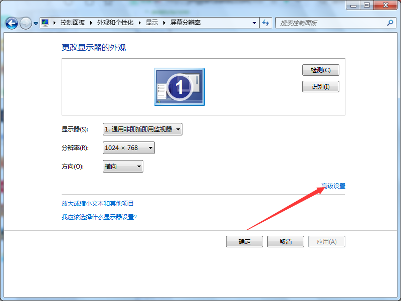 如图,进入屏幕分辨率设置页面,点击【高级设置】,弹出显示器属性窗口,