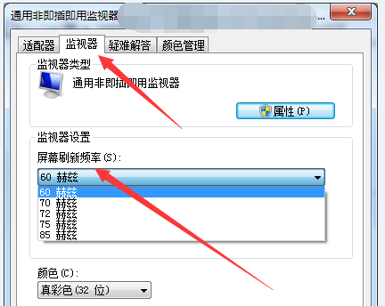 点击切换至【监视器】选项,选择【屏幕刷新频率】,频率调到最高,点击确定,即可解决问题。