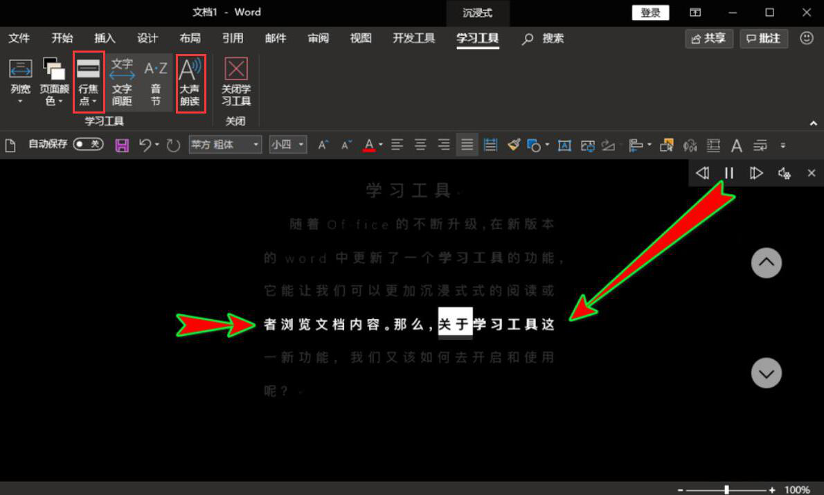 5、如果害怕看错行的话,也可以点击应用word学习工具中的行焦点和大声朗读功能,这样,一来,正在阅读的一行或者正在语音朗读的一行便会突出显示,如下图。能为自己带来沉浸式的阅读体验。