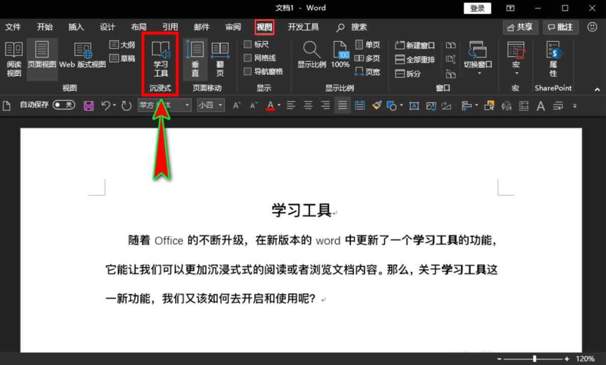 2、然后,点击word“视图”菜单,从中找到并点击沉浸式“学习工具”。
