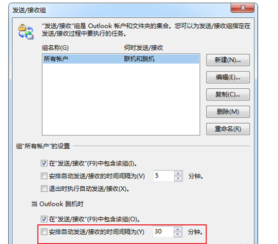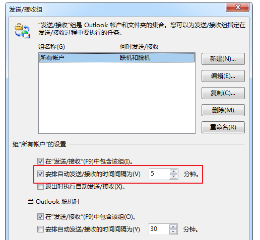 然后点击右侧的【发送和接收】按钮,弹出【发送/接收组】窗口,取消勾选【安排自动发送/接收的时间……】,