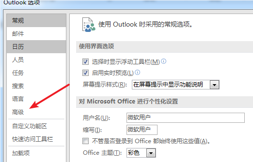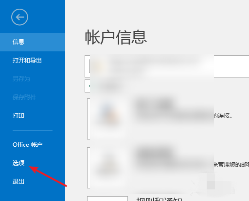 打开Outlook软件,进入界面,在菜单栏点击【文件】——【选项】,弹出以下窗口,