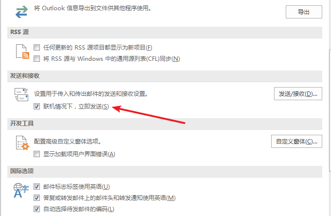 进入Outlook选项窗口,在左侧栏点击【高级】,选择【发送和接收】模块,取消勾选【联机情况下,立即发送】,