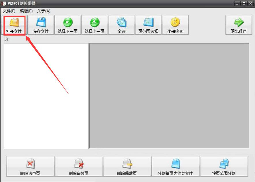 1、首先,我们打开PDF分割剪切器,点击界面左上方的“打开文件”按钮。