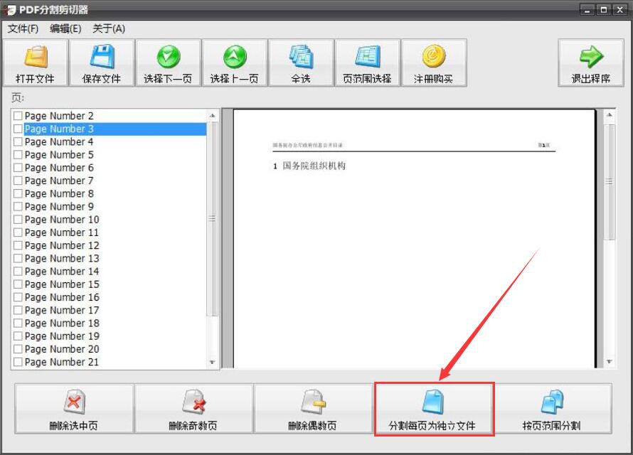 3、将PDF文件成功导入后,我们可以在界面左侧看到该PDF文件一共包含有多少页,而在右侧则可以浏览每一页对应的内容。如果是想用PDF分割剪切器将PDF文件每一页都分割出来,就点击界面下方的“分割每页为独立文件”按钮。