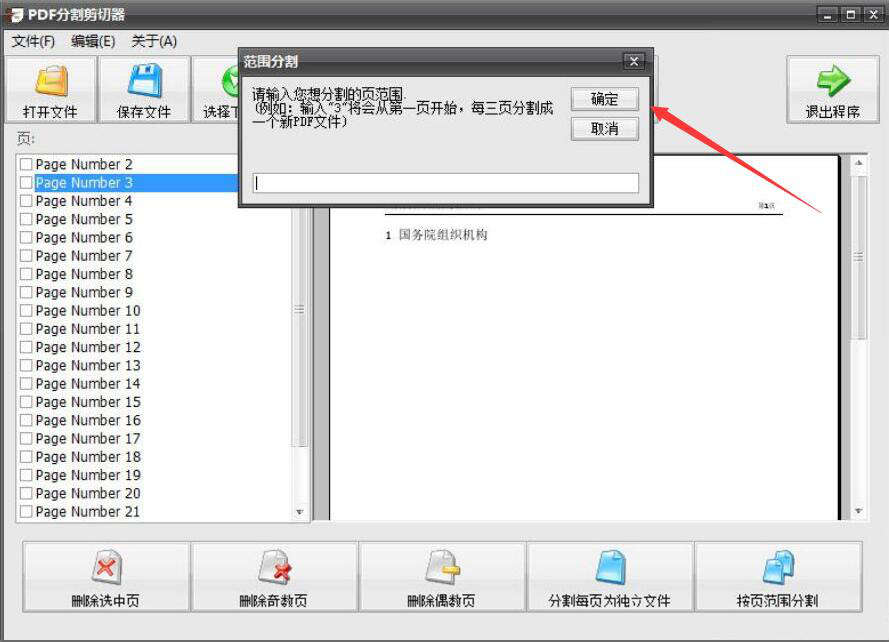 6、此时,PDF分割剪切器便会弹出范围分割窗口,我们可以根据自己的需要来自定义分割的页面范围,再点击“确定”按钮。