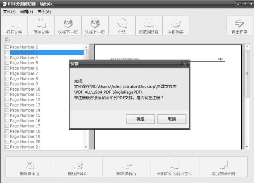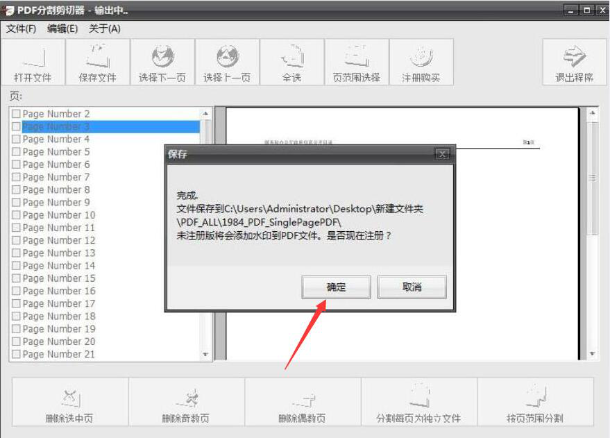 7、最后,弹出如下图的窗口提示,说明PDF分割剪切器成功分割了PDF文件,需要注册的话,就点击“确定”按钮。