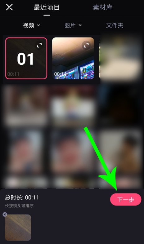 跳转至以下界面,点击【最近项目】,选择视频素材,进行下一步,