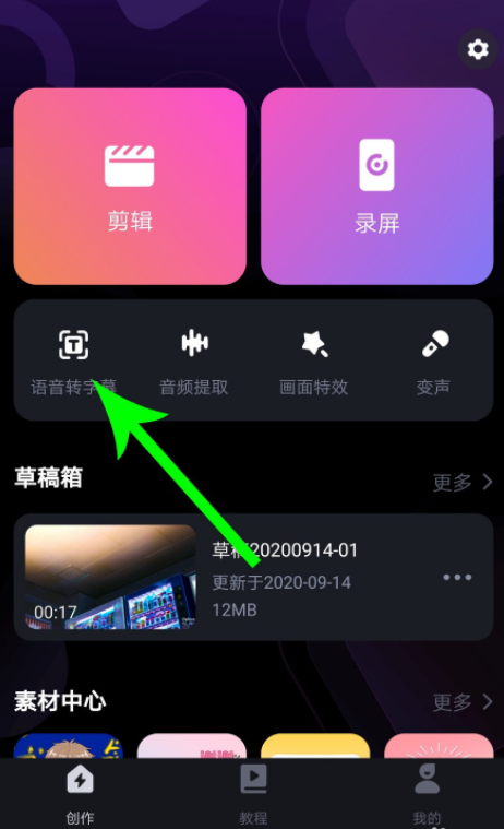在手机中打开必剪APP,进入首页,点击【语音转字幕】,