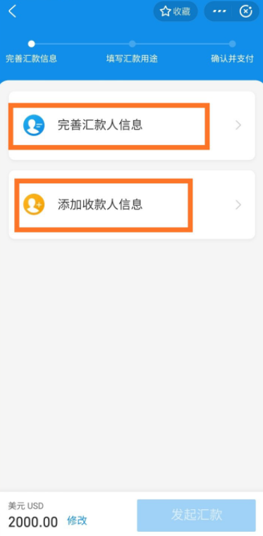 点击【完善汇款人信息】、【添加收款人信息】,填写相关信息,收款银行所在地根据首字母进行选择,最后进行汇款。