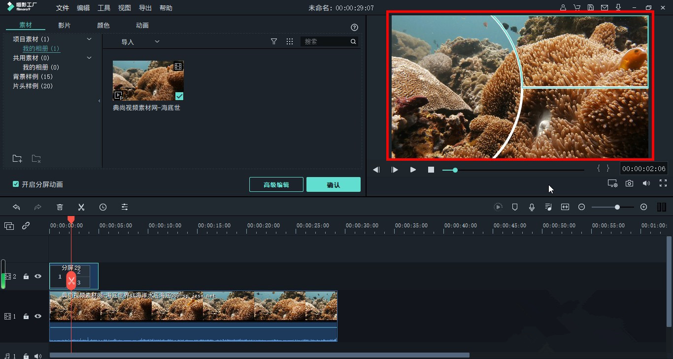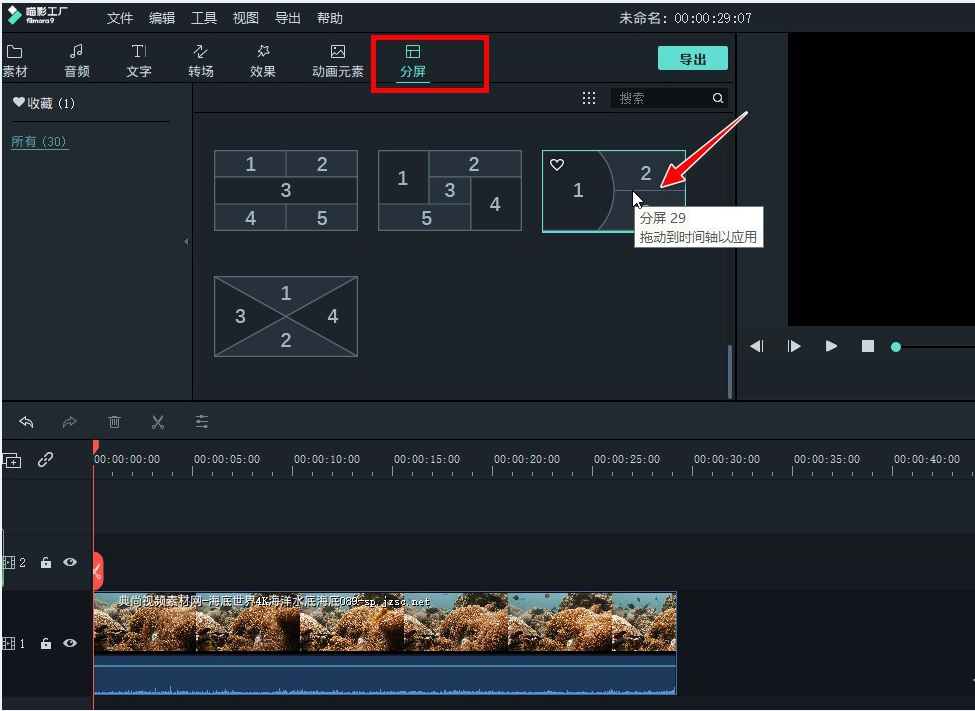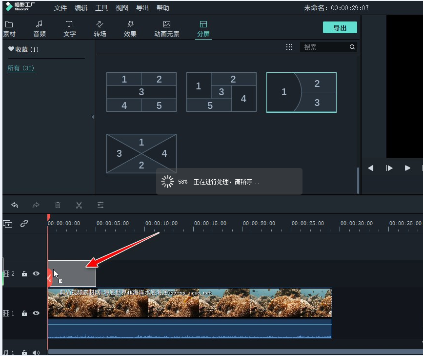 使用鼠标拖动分屏模板组件,将其移动到视频上方的轨道区位置,