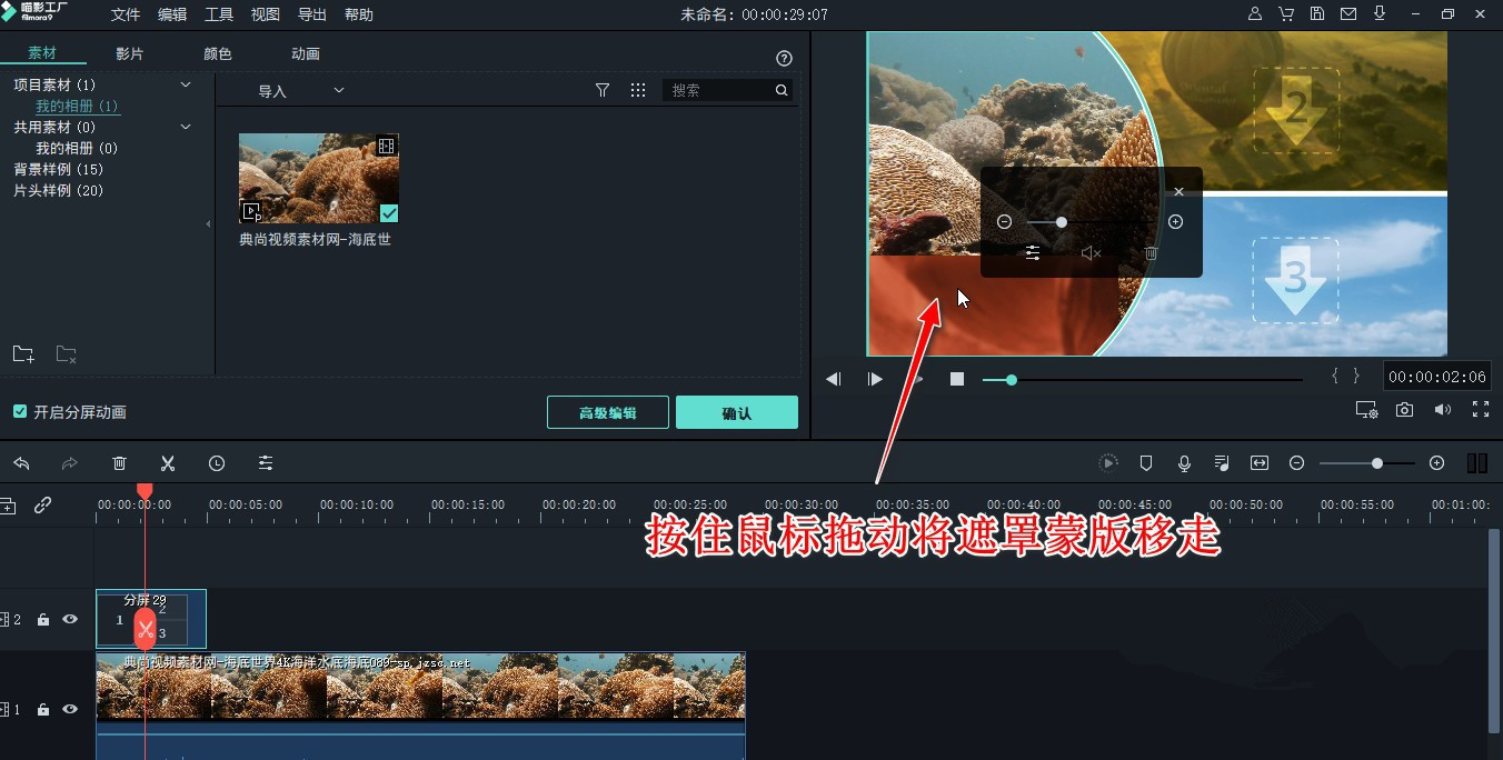 按住鼠标左键拖动,将遮罩蒙版移走,顺利移走分屏模板组件上的遮罩蒙版,