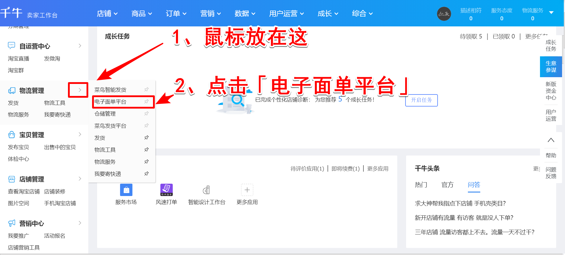 在电脑中打开千牛,输入账号,登录千牛工作台,进入界面,点击【物流管理】——【电子面单平台】,