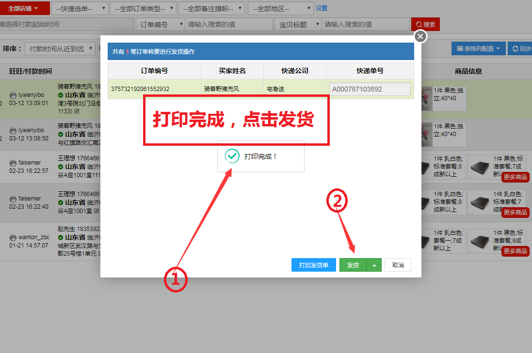 如若,打印完成,点击发货即可,