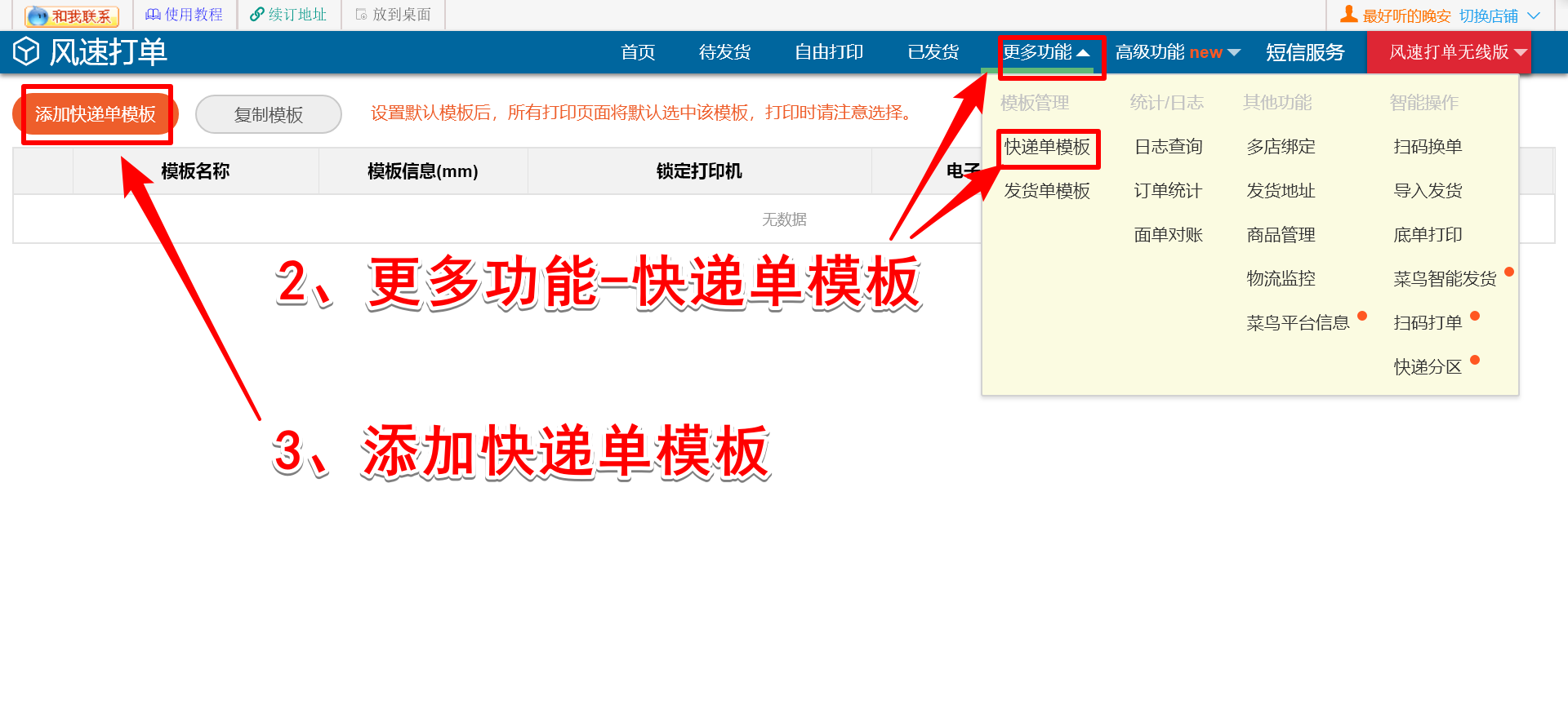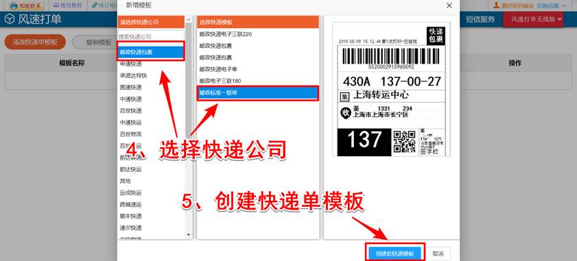 如图,点击【更多功能】——【快递单模板】,添加快递单模板,选择已开通电子面单的快递公司,创建快递单模板,