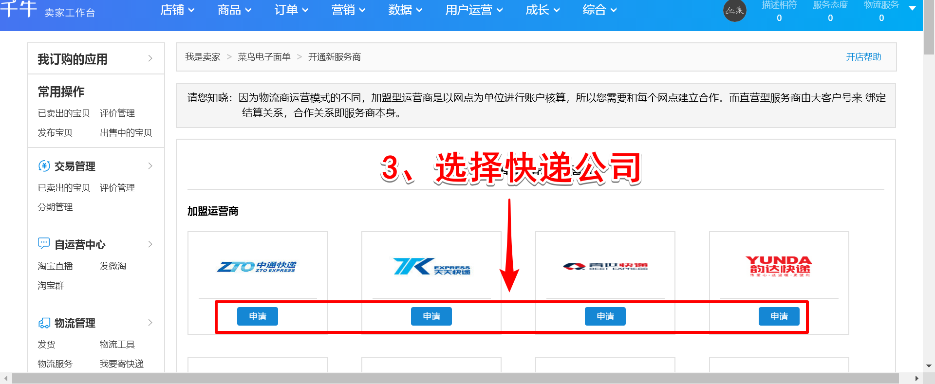 如图,选择需要开通的快递公司,点击【申请】,弹出窗口,新建发货地址,填写相关信息,提交申请并联系快递公司审核,