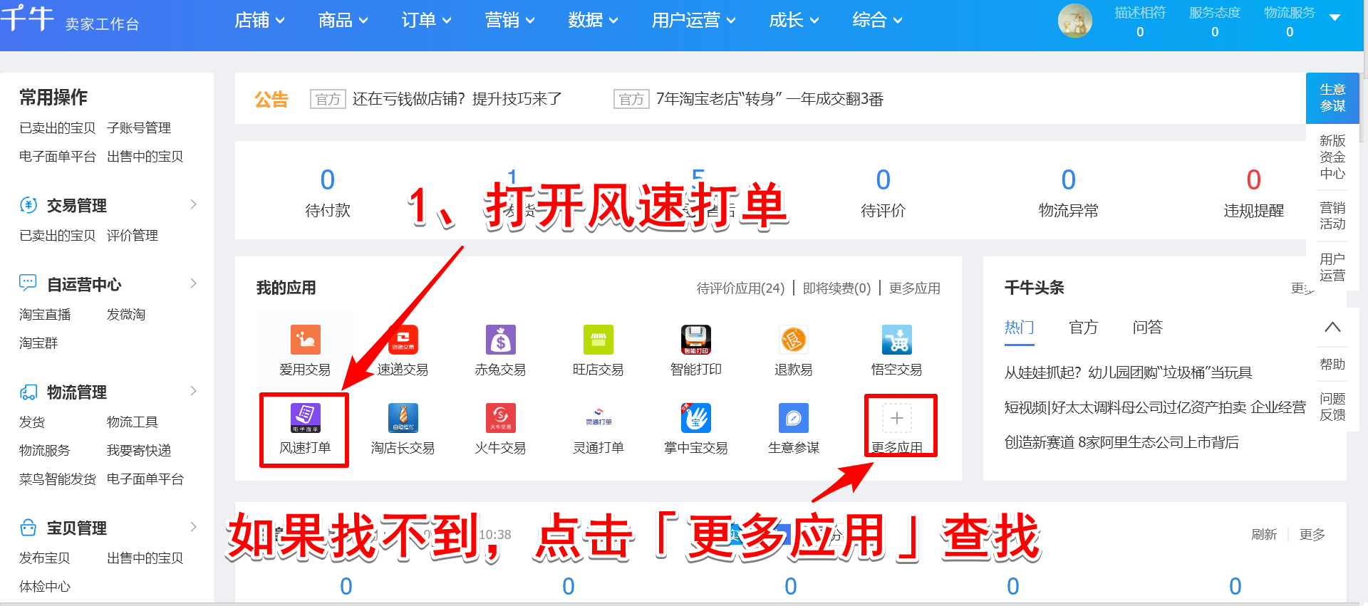 现在设置模板,点击打开【风速打单】,如果找不到,点击【更多应用】进行查找,