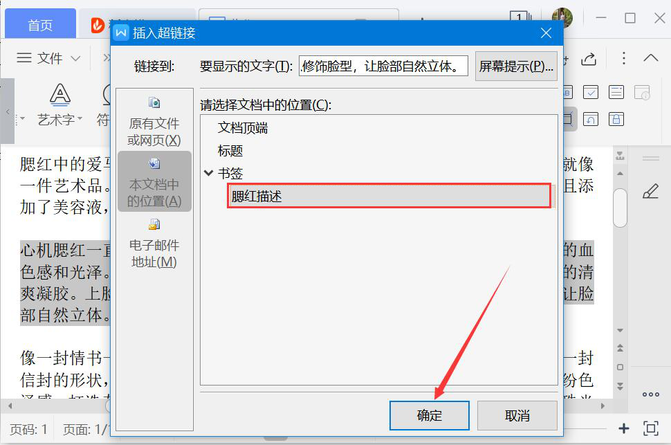 5、word会弹出插入超链接的窗口,因为我们是想要在同一个文档中实现内容的跳转,所以点击切换至“本文档中的位置”,并在其右侧界面中选择自己刚才创建的书签名,点击“确定”按钮。