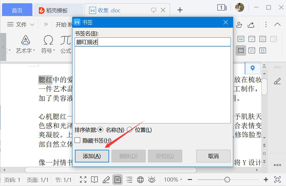 3、在弹出的窗口中,我们自定义书签名,并点击“添加”按钮,从而继续word插入超链接的下一步操作。