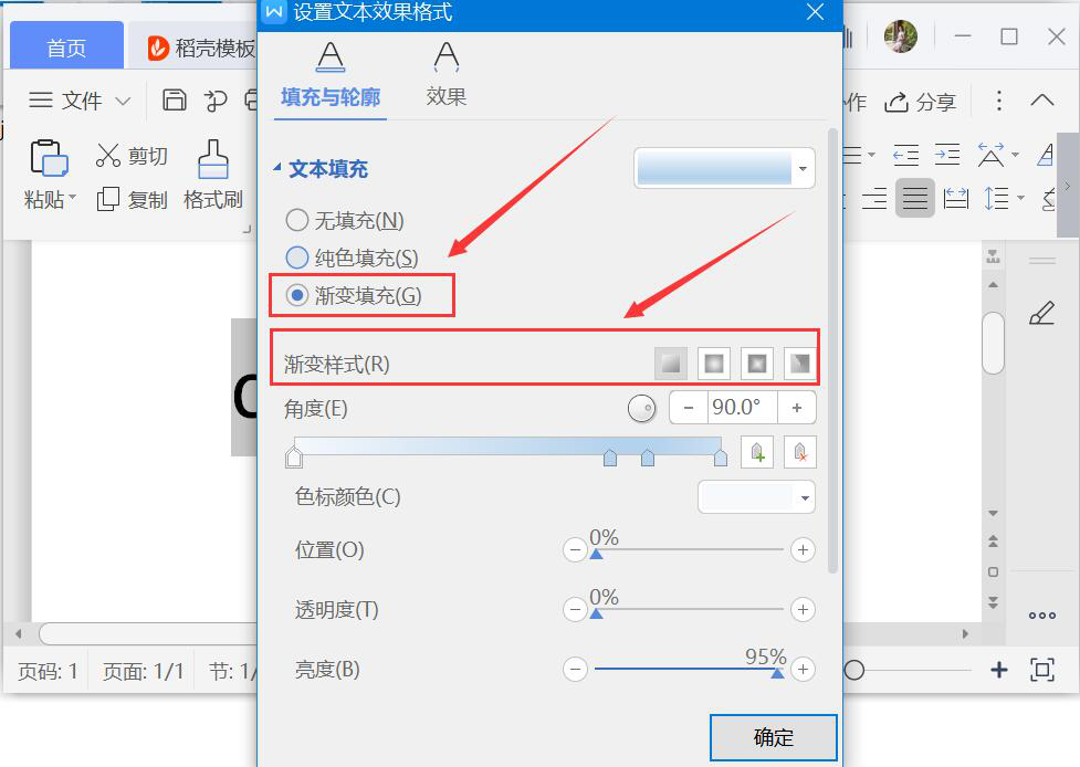 5、文本填充的方式选择“渐变填充”,并根据自己想要的文字酷炫效果来选择渐变样式。