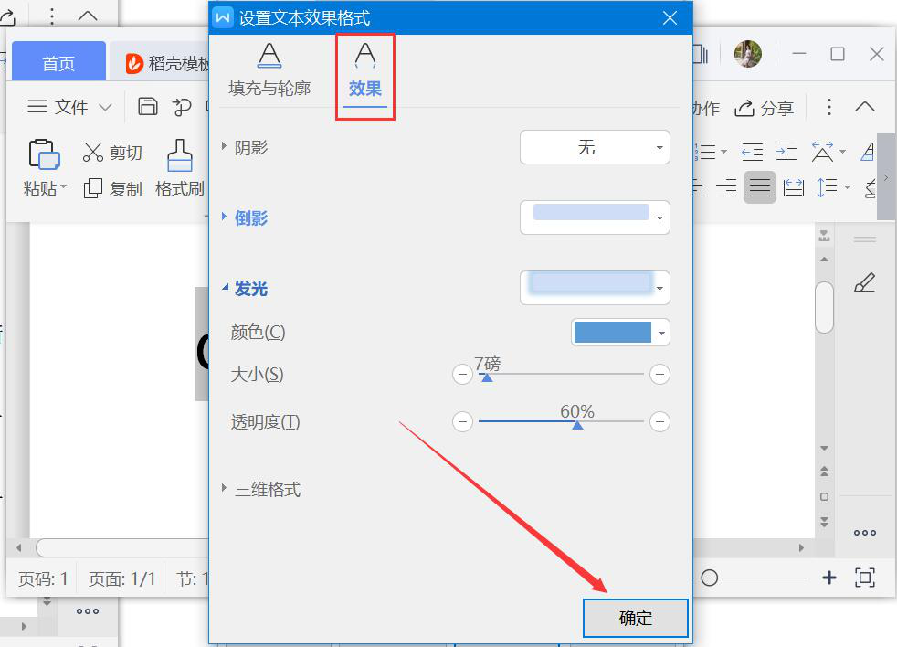 8、如果还希望为word文字制作更多的酷炫效果,可以切换至“效果”选项卡,根据自己的需要来设置阴影或倒影或发光,例如为文字添加了发光效果。设置完成,点击“确定”按钮。