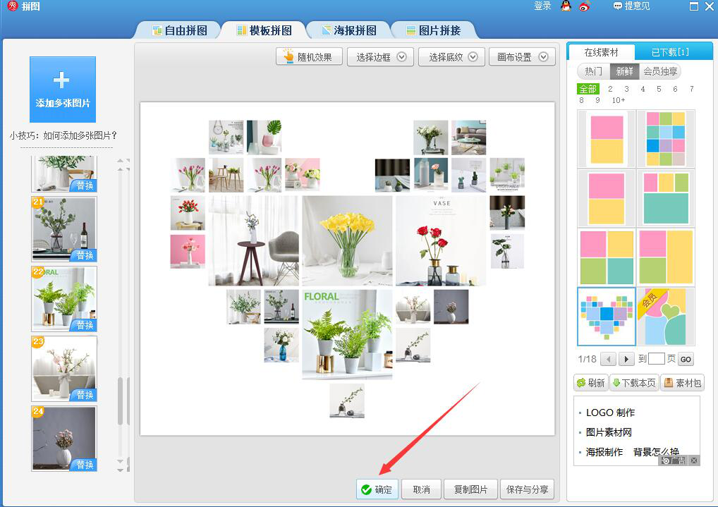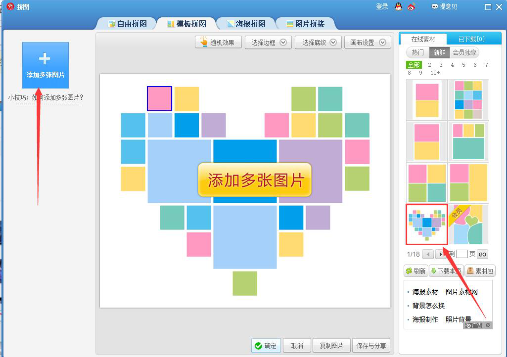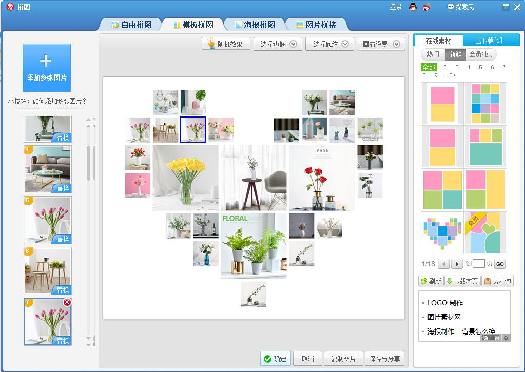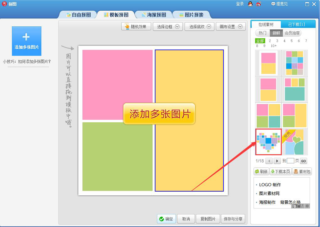 3、进入美图秀秀的模板拼图操作界面后,点击界面右侧在线素材中的心形模板拼图样式。