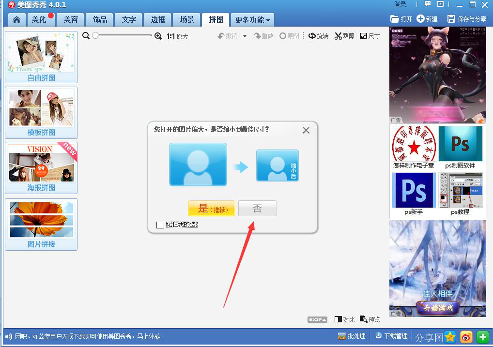 9、此时,美图秀秀会弹出关于图片尺寸的提醒窗口,我们点击“否”,这样一来图片的大小不会受到影响了。