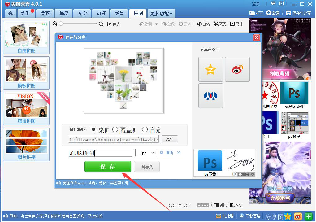 11、最后,在保存与分享的窗口中,我们设置保存路径和为该心形拼图命名,点击“保存”按钮,美图秀秀就会将该心形拼图给保存起来。