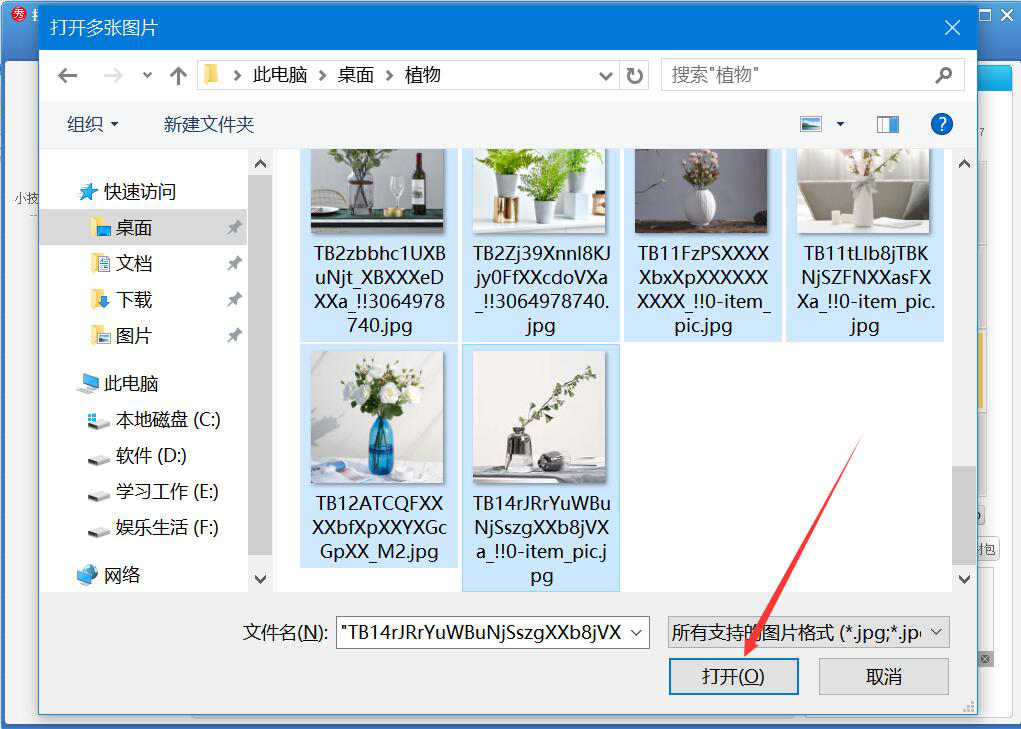 5、在弹出的窗口中,将需要做出心形拼图效果的图片素材选中,点击“打开”按钮,将其导入美图秀秀。