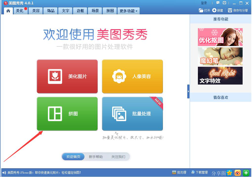 1、首先,我们打开美图秀秀,在功能向导页面中点击“拼图”。