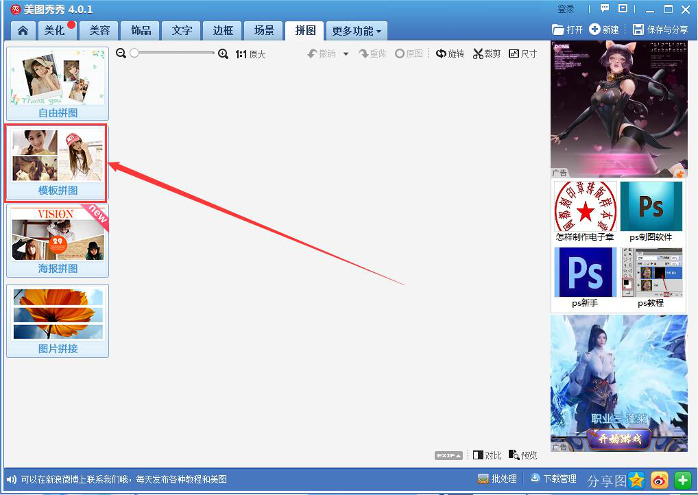 2、然后,在美图秀秀的拼图选项卡中,点击左侧栏的“模板拼图”。