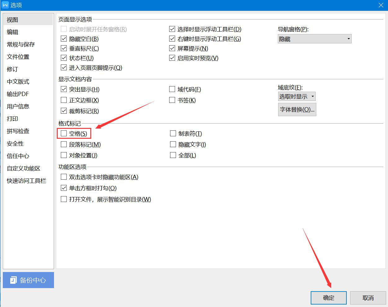 4、而为了取消word输入空格时显示圆点,我们就取消勾选“空格”,再点击窗口右下方的“确定”按钮。