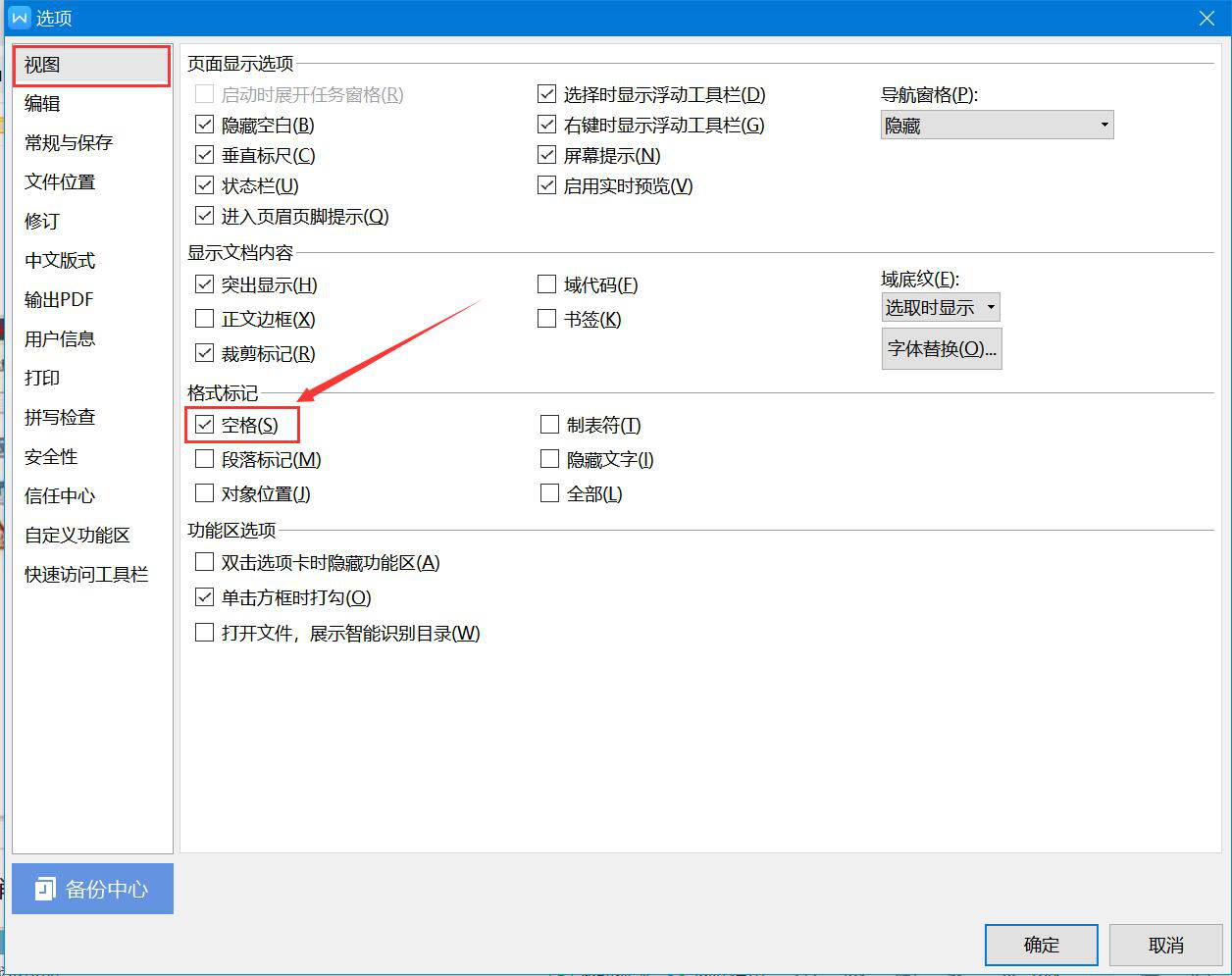 3、接下来,在word选项设置中,切换至“视图”选项卡,找到其右侧界面格式标记中的“空格”。可以发现它被勾选上了,所以才会出现word输入空格时显示圆点的情况。