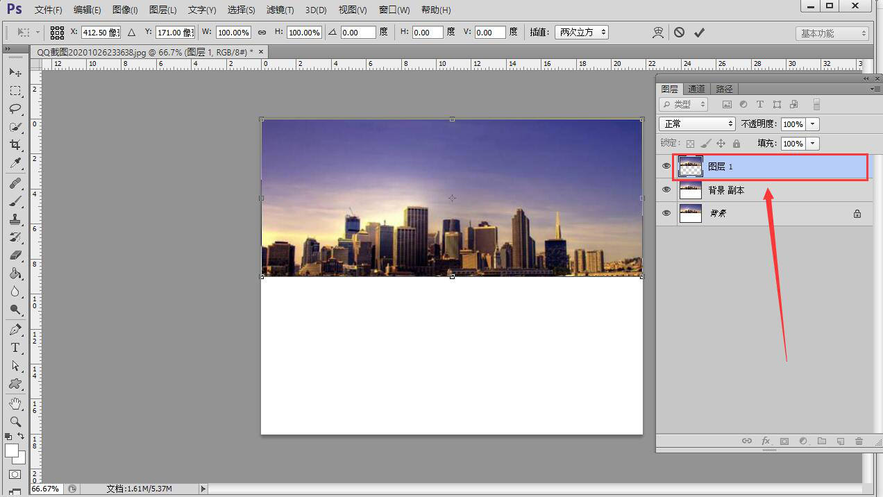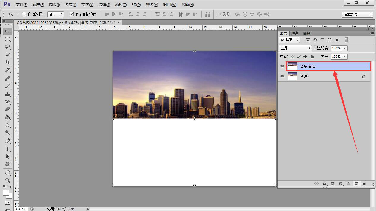 4、接下来,我们利用组合键“Ctrl+J”将原城市图层拷贝,如下图所示。