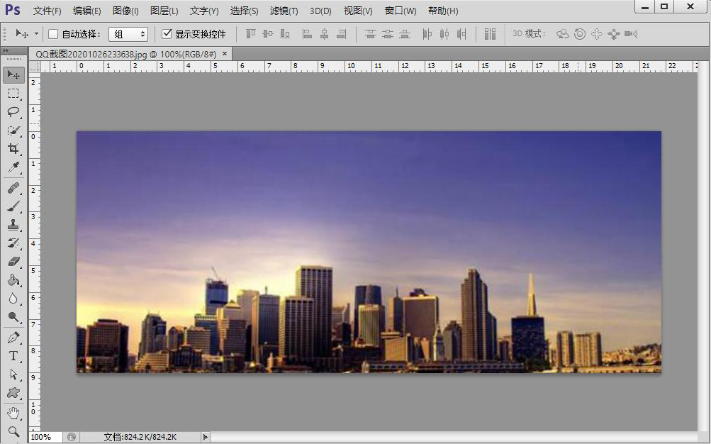 1、首先,我们在PS中打开需要做出城市倒影效果的图片。
