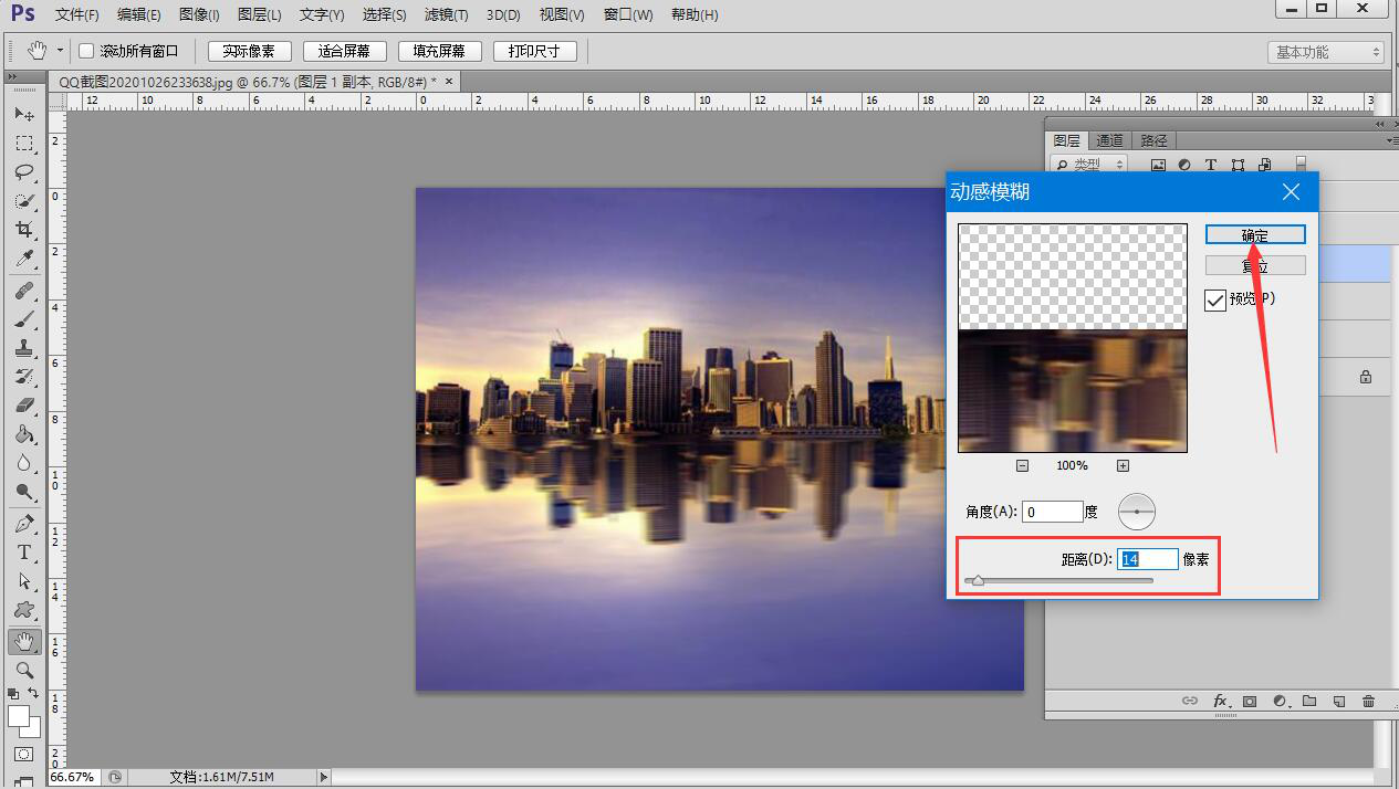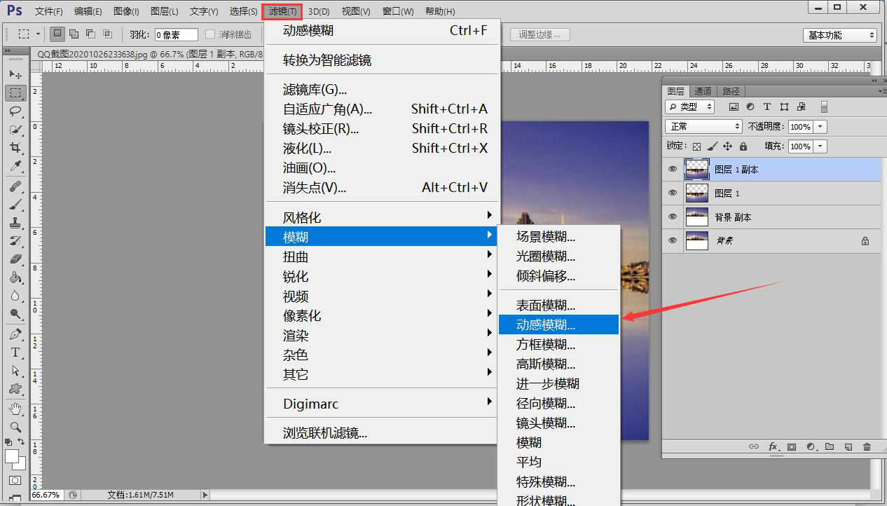 9、但是,为了让PS制作的城市倒影效果更逼真,我们点击“滤镜”菜单中的“模糊”,并在其子菜单中点击“动感模糊”。