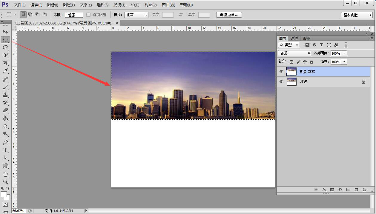 5、拷贝后,再调用PS左侧功能栏中的选框工具,按住鼠标左键在城市图层中选择需要做出倒影的部分,并且利用组合快捷键“Ctrl+C”复制选区。