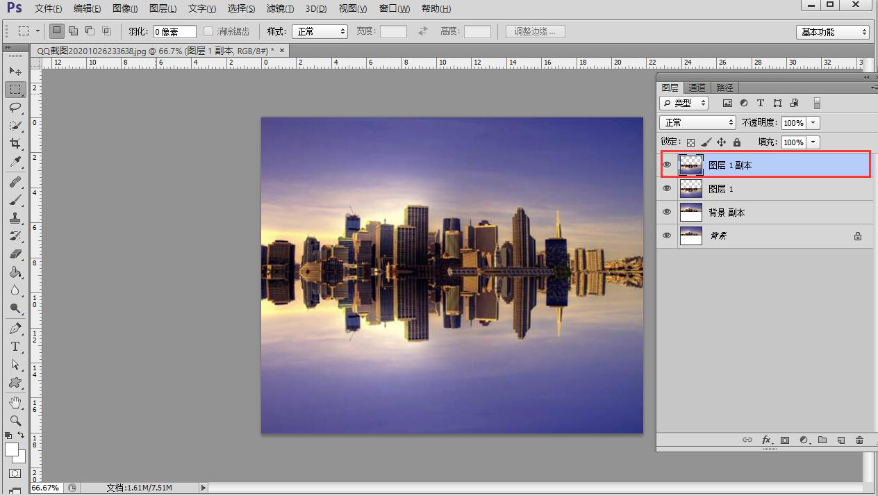 6、利用组合快捷键“Ctrl+V”粘贴选区,并将该选区作为城市倒影图层。
