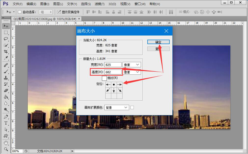 3、弹出画布大小窗口,因为要做出向下的城市倒影效果,我们便将定位的方向设置为向下,并将图片原来的高度增加一倍,再点击“确定”按钮。