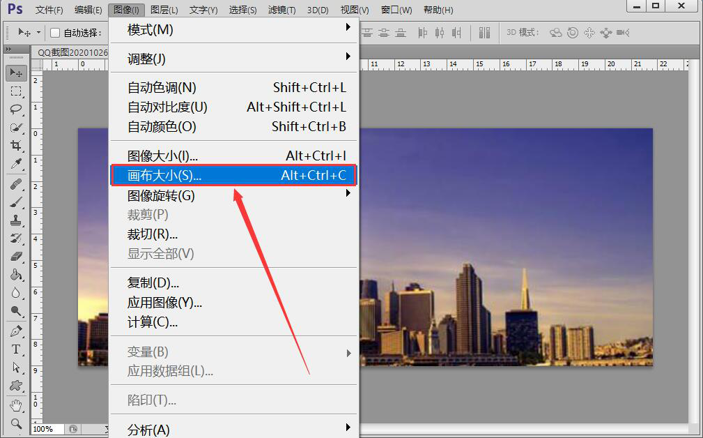 2、然后,点击PS“图像”菜单中的“画布大小”。