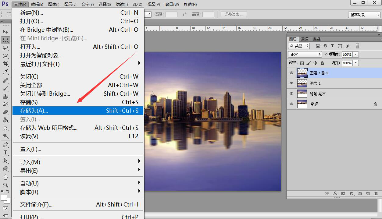 11、最后,回到PS主操作界面,可以看到做出来的城市倒影效果是比较理想的,我们便点击“文件”菜单中的“存储为”选项,将做好的城市倒影效果给保存下来。