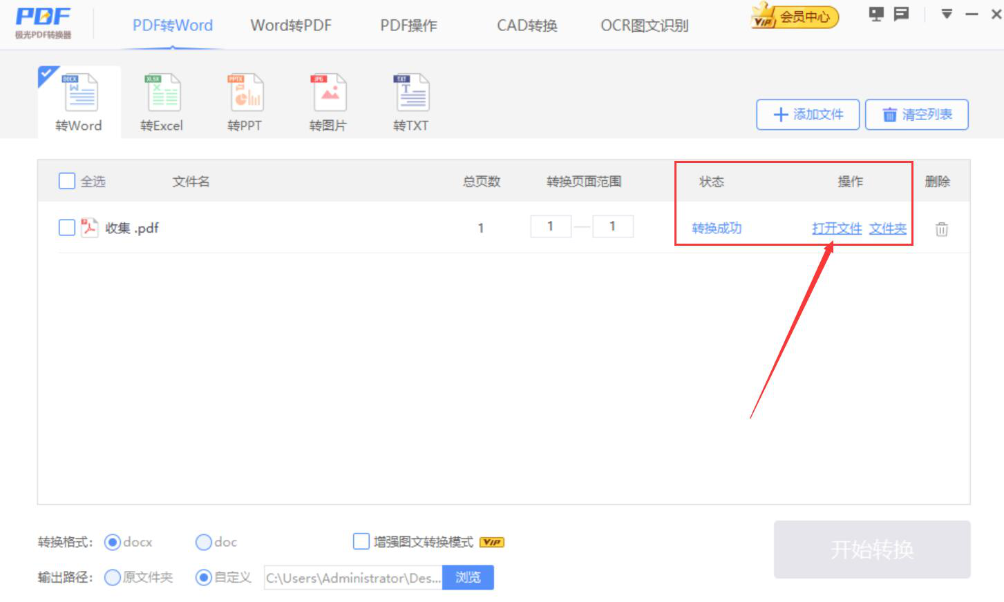 8、最后,当极光PDF阅读器完成PDF转word的时候,我们点击“打开文件”便可以快速看到转换后的word文档了。