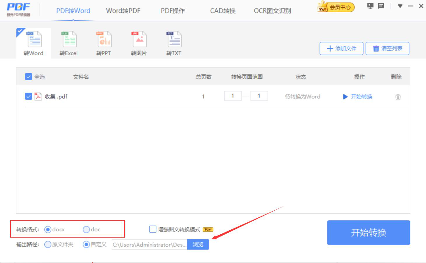 5、接下来,我们设置PDF转word后的转换格式,并点击“浏览”按钮自行设置极光PDF阅读器将PDF转word后的保存路径。