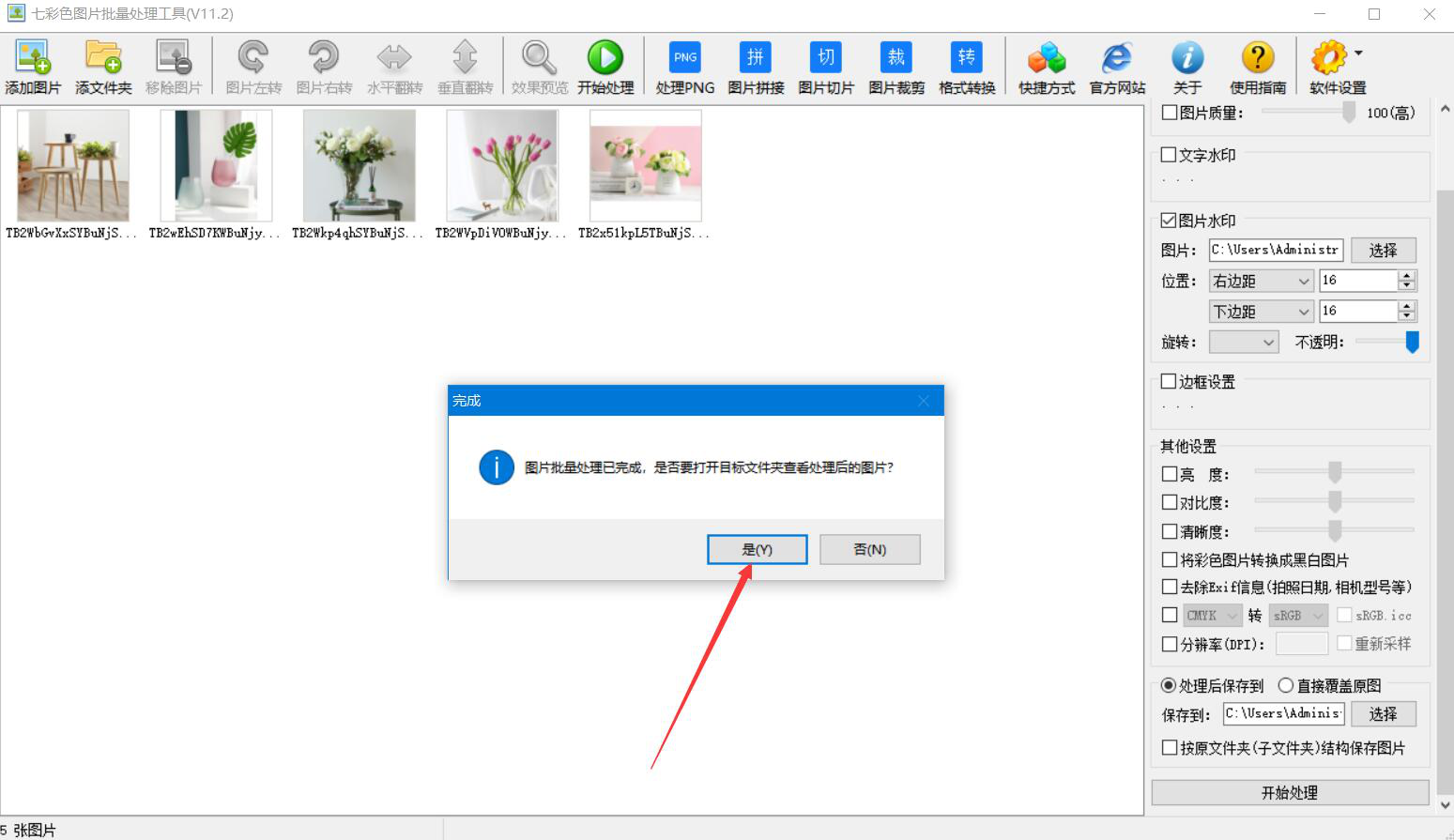 9、最后,弹出如下图窗口提示,说明七彩色图片批量处理工具批量添加图片水印完成。我们想要立即打开查看的话,就单击“是”按钮。