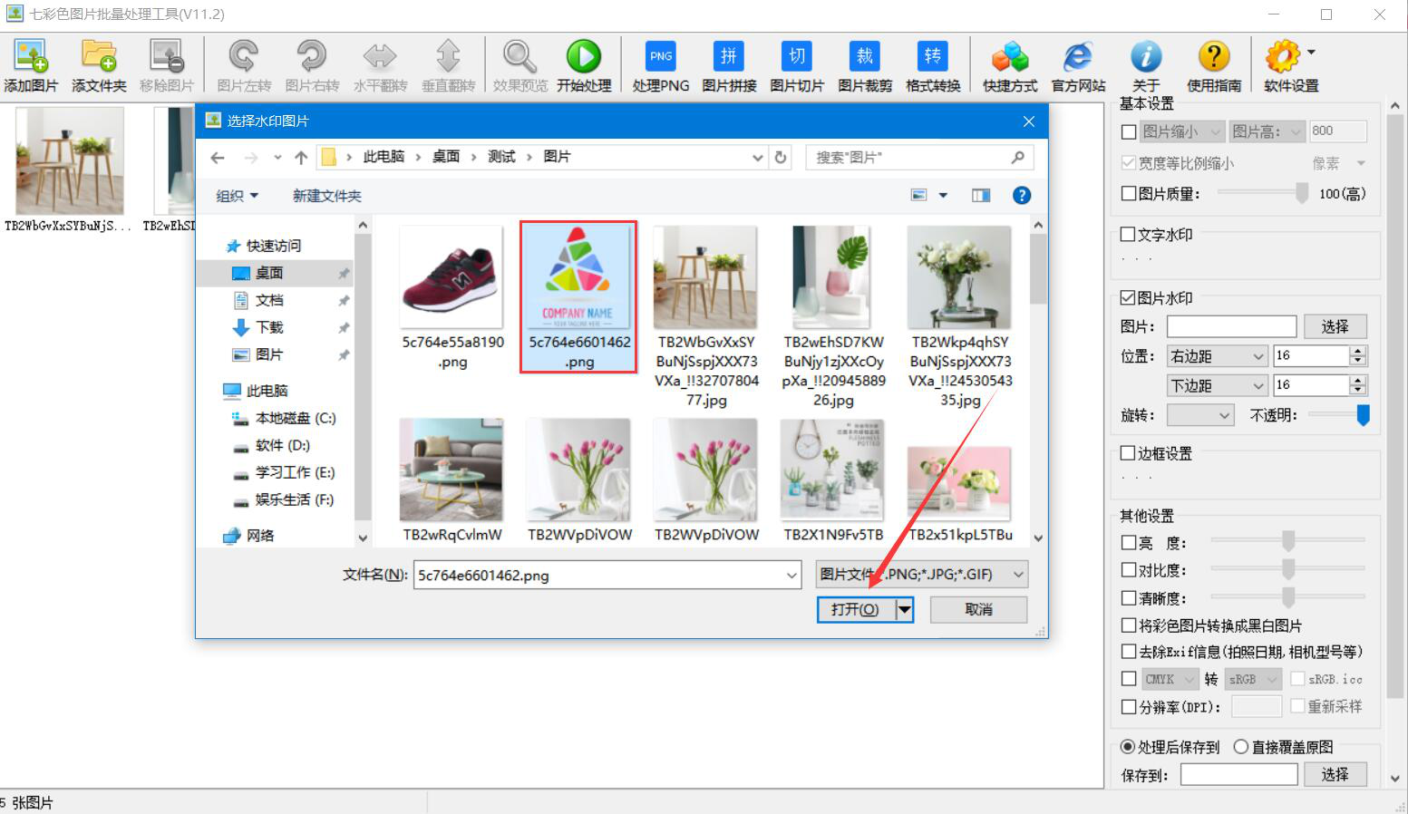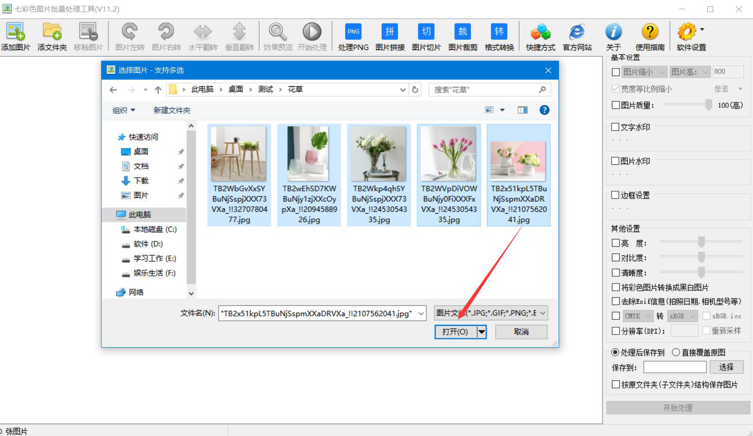 2、在弹出的窗口中,将需要批量添加图片水印的图片素材选中,点击“打开”按钮,将它们一并导入七彩色图片批量处理工具。