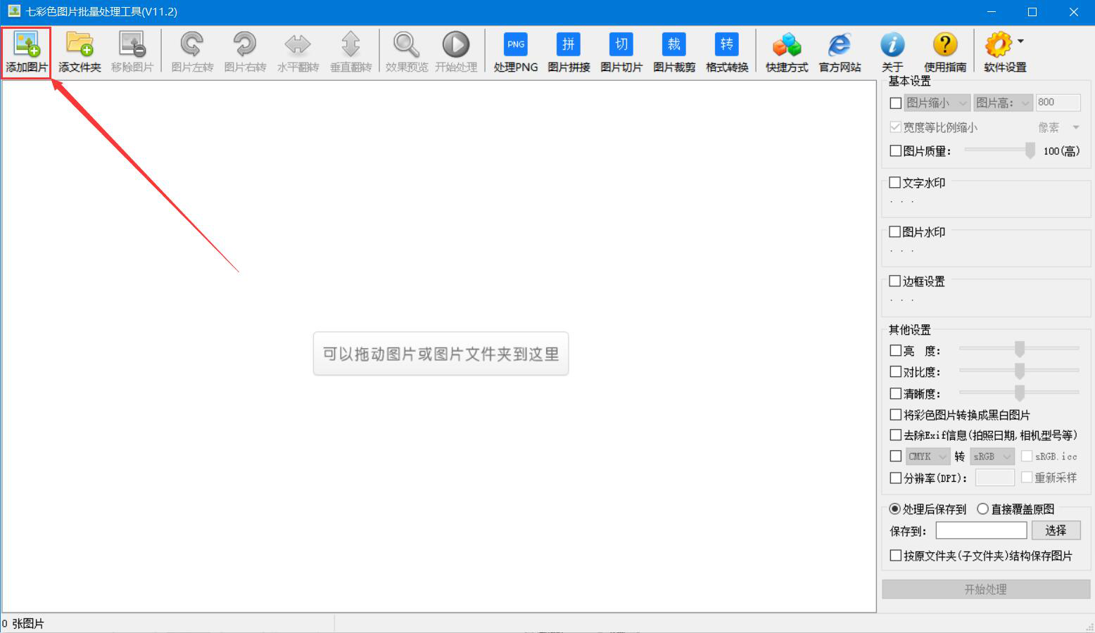 1、首先,我们打开七彩色图片批量处理工具,点击界面左上方的“添加图片”按钮。