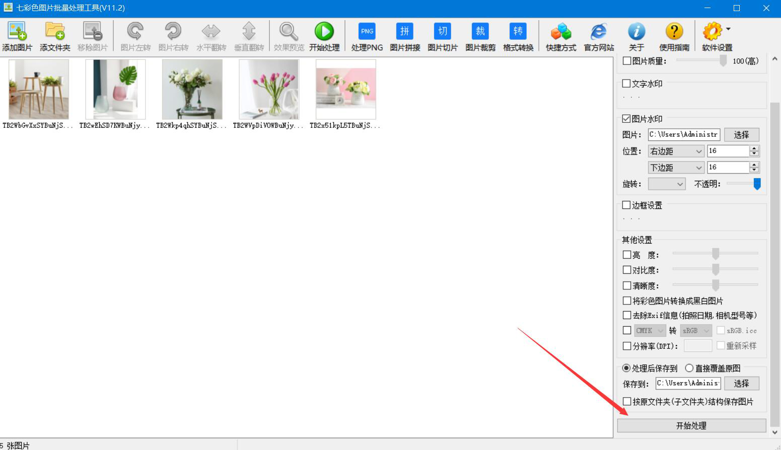 8、接着,我们点击“开始处理”按钮,七彩色图片批量处理工具便执行批量添加图片水印的命令。