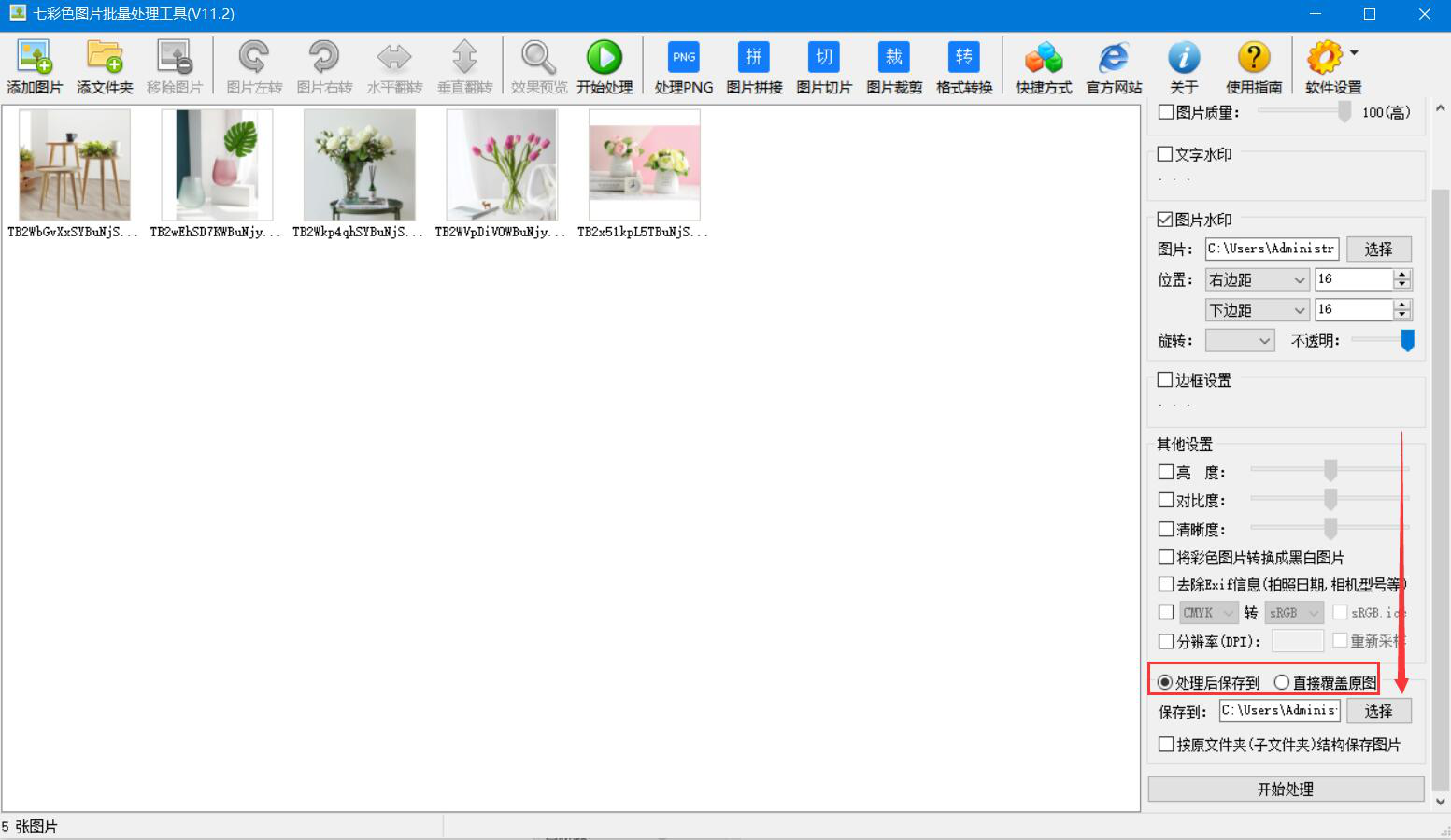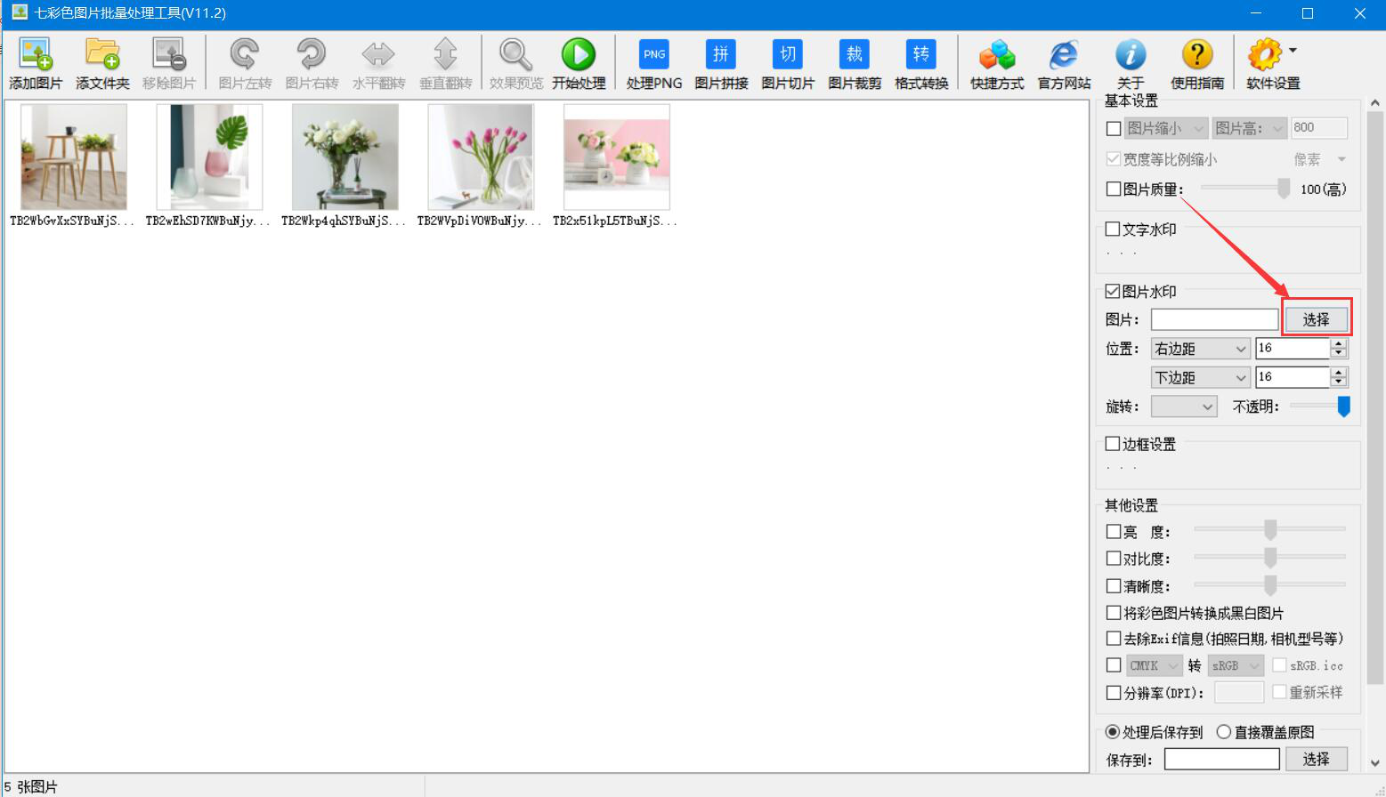 7、根据自己的情况选择七彩色图片批量处理工具批量添加图片水印后是直接覆盖原图还是另存到自己指定的路径。其中,点击“选择”按钮即可自定义路径。