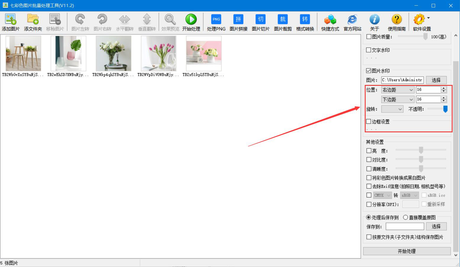 6、接下来,在七彩色图片批量处理工具中,我们根据自己的实际需要来设置批量添加的图片水印的位置、大小和透明度、边框。
