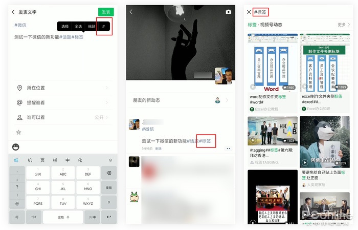 话题标签正式上线微信朋友圈,对于这项功能,很多小伙伴也是期盼以久。使用方法足够简单,只要在编辑朋友圈时,长按空白处不松手即可,之后快捷菜单会显示出一个话题标签图标(#)。而添加好的标签,也会自动呈现蓝色,别人点击后就会显示出视频号里的相关内容。